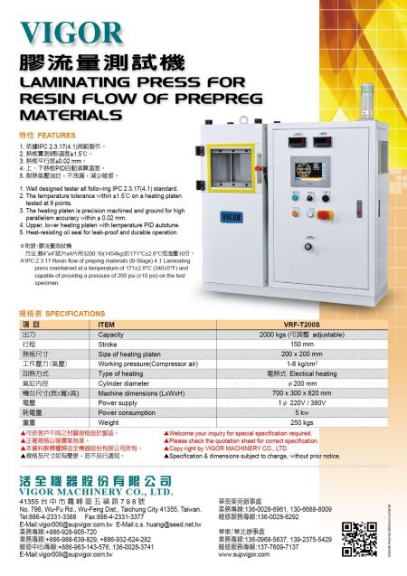 Основанная в Тайване, Vigor Machinery CO., LTD. является поставщиком прессов для ламинации, резки и разделения в электронной, композитной, пластиковой и резиновой промышленности. Основное оборудование включает пресс для ламинации печатных плат и вакуумный пресс, быстрый вакуумный пресс для гибких печатных плат, лабораторный пресс, пресс высокой температуры, горячий и холодный пресс, резиновый резак, резак и разделитель, испытатель смолы и т. д.