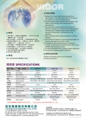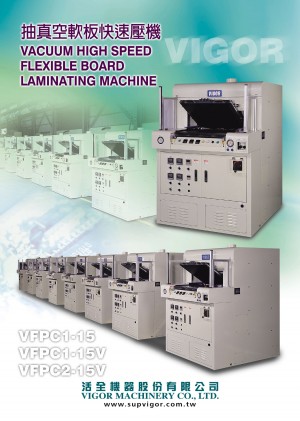Con sede en Taiwán, Vigor Machinery CO., LTD. es un proveedor de prensas de laminación, cortadoras y máquinas de corte en las industrias de electrónica, compuestos, plásticos y caucho. Las principales máquinas incluyen prensas de laminación PCB y al vacío, prensas rápidas al vacío FPCB, prensas de laboratorio, prensas de alta temperatura, prensas en caliente y en frío, cortadoras de láminas de cobre, cortadoras y máquinas de corte, probadores de resina, etc.